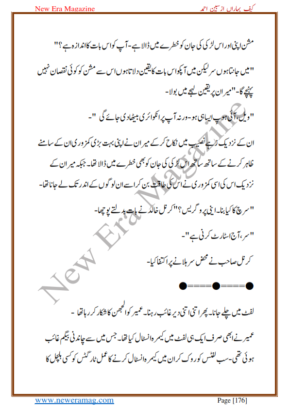 New Era Magazine presents a new urdu social romentic novel Kaif e Baharan​ written by Sabeen Ahmed. This is the story of patriotic persons who serve day and night just to save their country from traitors and enemies. This is the story of 3 friends named Umair, Meraan and Shehroz. Umair and Shehroz were the brothers, In the lead of Meraan, Shehroz and Umair started a mission to save lives. During the mission Marian fall in love with a girl named Bahar and both get nikkahfied. They risk their lives to complete the mission. After successfully completed mission they live to gather happily ever after. Hope you like this Story and to Know More about the story of the novel you must read it.